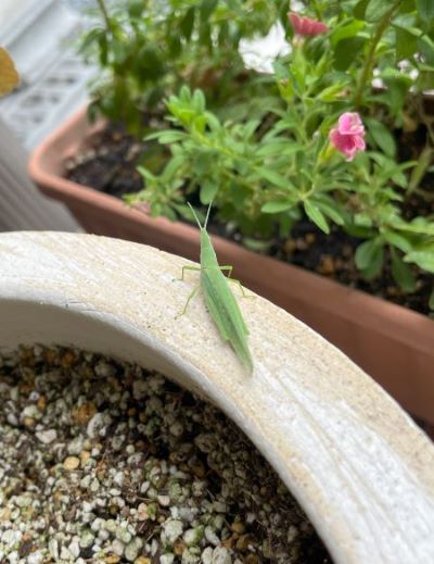 虫は基本的には苦手ですがバッタは大丈夫です。むしろ、緑が鮮やかで綺麗だったのでついスマホで写真をとりました。バッタの苦手な方、アップの写真がありますので、あしからず。